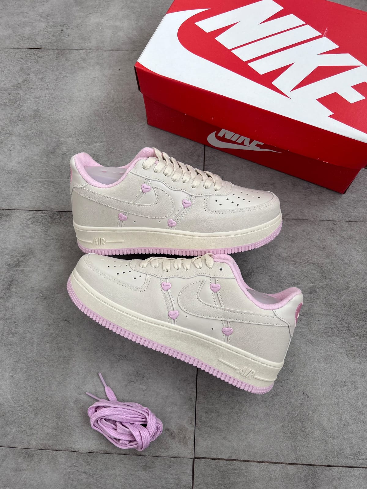 Nike Air Force 1 Premium Edição Especial Feminina, com detalhes delicados em rosa e acabamento premium. Modelo confortável, versátil e cheio de estilo. Numeração do 34 ao 39, forma normal. Frete grátis e acompanha 1 par de cadarço extra de brinde 🎁✨