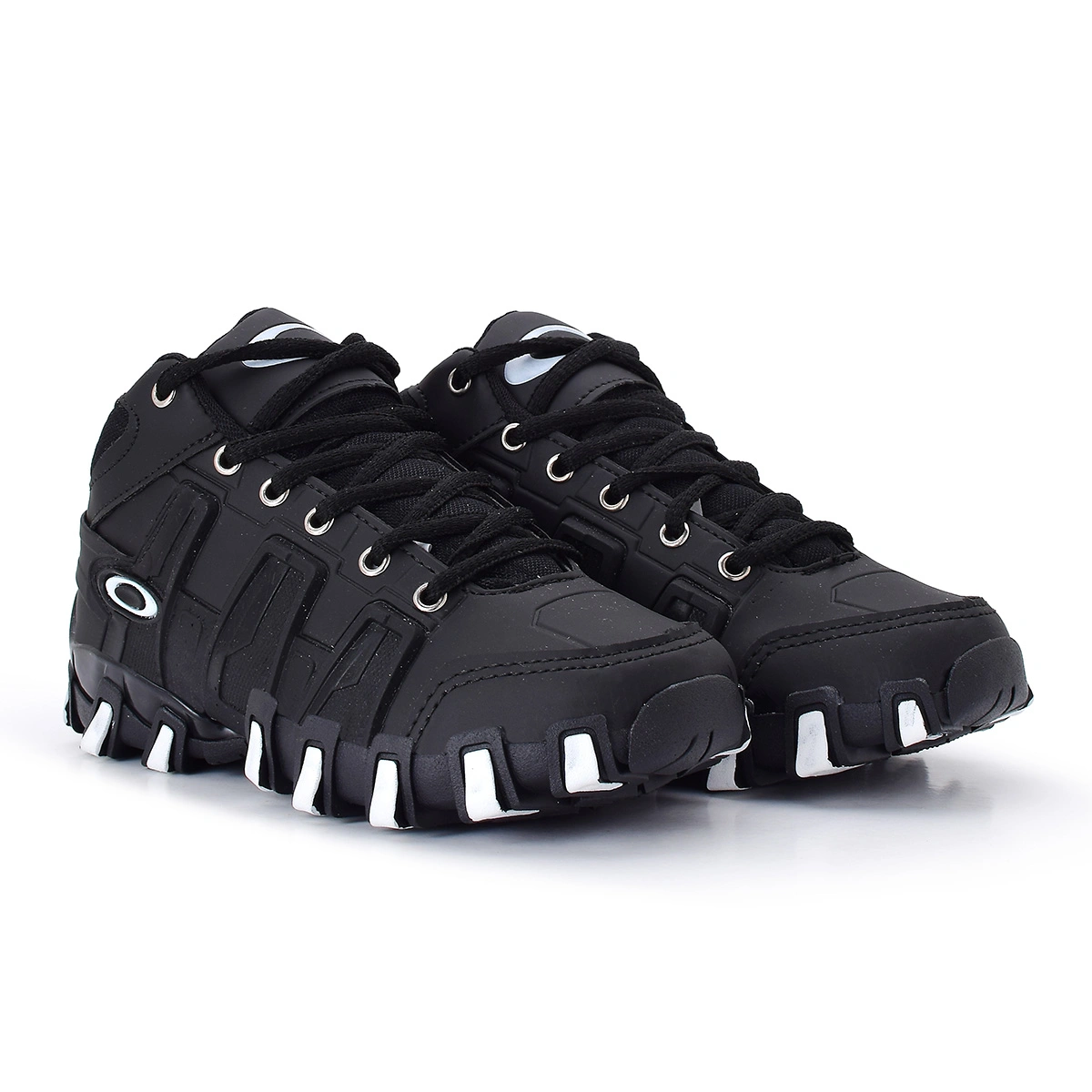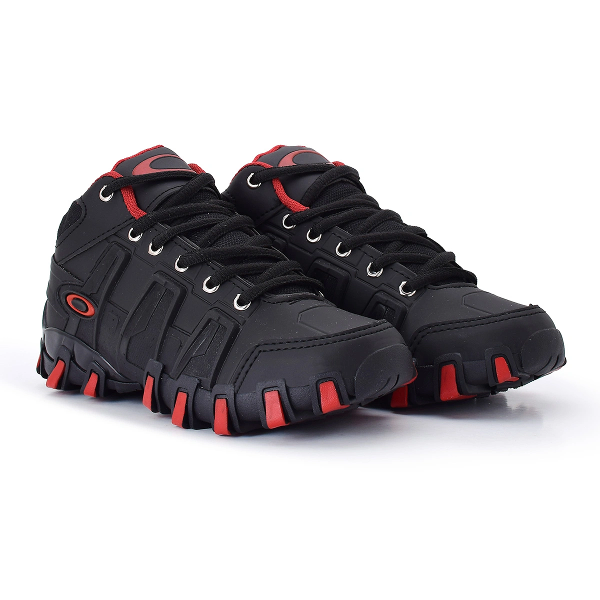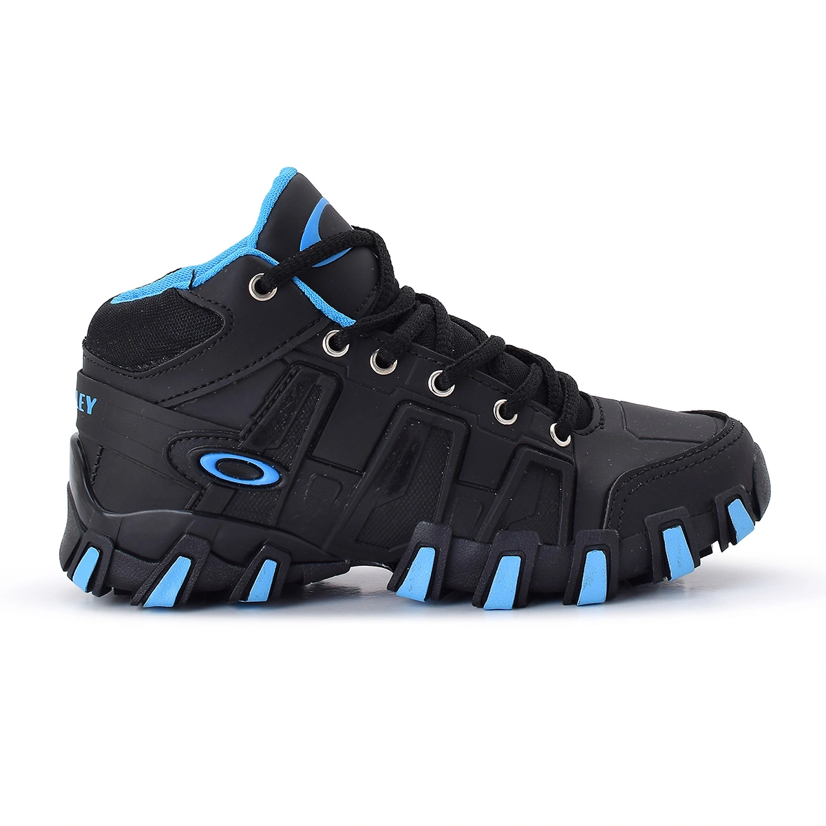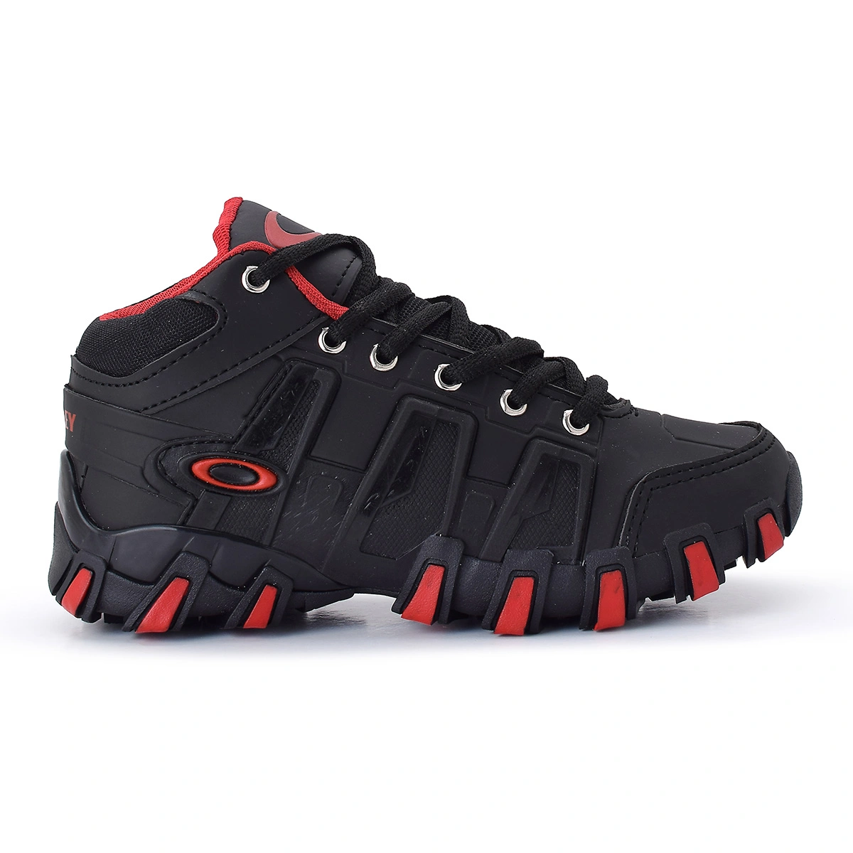 O Tênis Infantil Oakley possui cabedal confeccionado em Couro Sintético, Solado Emborrachado feito para tração, possui a logo da Oakley nas laterais e na língua, Parte traseira escrito Oakley, Lateral emborrachada para suportar maior atrito.